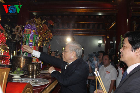 (VOVworld) - В субботу генеральный секретарь ЦК КПВ Нгуен Фу Чонг посетил провинцию Футхо с рабочим визитом. В связи с приближающим праздником поминовения королей Хунгов – основателей древнего Вьетнама Нгуен Фу Чонг возжигал благовония в память о королях Хунгах в храме Тхыонг, возложил венок к мавзолею королям Хунгам и возжигал благовония в храме прародителя вьетнамского народа Лак Лонг Куана.