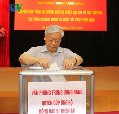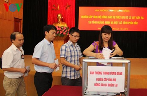 (VOVworld) - 12 августа канцелярия ЦК Компартии Вьетнама пожертвовала деньги в поддержку пострадавших от наводнений, произошедших в провинции Куангнинь и некоторых северовьетнамских провинциях. В данном мероприятии приняли участие генеральный секретарь ЦК КПВ Нгуен Фу Чонг и его предшественники Ле Кха Фиеу и Нонг Дык Мань, а также секретарь ЦК КПВ, заведующий канцелярией ЦК КПВ Чан Куок Выонг. Все работники канцелярии ЦК КПВ пожертвовали денежную сумму, эквивалентную по меньшей мере одному трудодню для того, чтобы оказать помощь соотечественникам в преодолении трудностей из-за стихийного бедствия. Общая сумма благотворительного пожертвования составляет более 400 миллионов донгов.