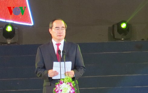 | Глава Отечественного фронта Вьетнама Нгуен Тхиен Нян выступает на церемонии открытия. Фото: VOV/ Tra My |