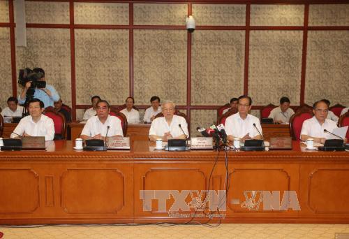 (VOVworld) – 25 августа в Ханое прошла рабочая встреча между Политбюро ЦК КПВ и Постоянным бюро парткома Министерства общественной безопасности Вьетнама, посвященная подготовке к предстоящему съезду парткома МОБ на период 2015-2020 годов. Выступая по итогам рабочей встречи, генсекретарь ЦК КПВ Нгуен Фу Чонг предложил парткому МОБ воспринять мнения Политбюро ЦК КПВ, повысить руководящую способность и боевую готовность парторганизаций, в дальнейшем создать прозрачные и мощные силы народной милиции для прочной защиты политической безопасности и общественного порядка, что поспособствует строительству и защите Отечества. Генсекретарь ЦК КПВ Нгуен Фу Чонг подчеркнул: «Силы Народной милиции должны освоить ситуацию с тем, чтобы предоставить партии и государству точные консультации. Необходимо проявить инициативу по борьбе с любыми подрывными замыслами».