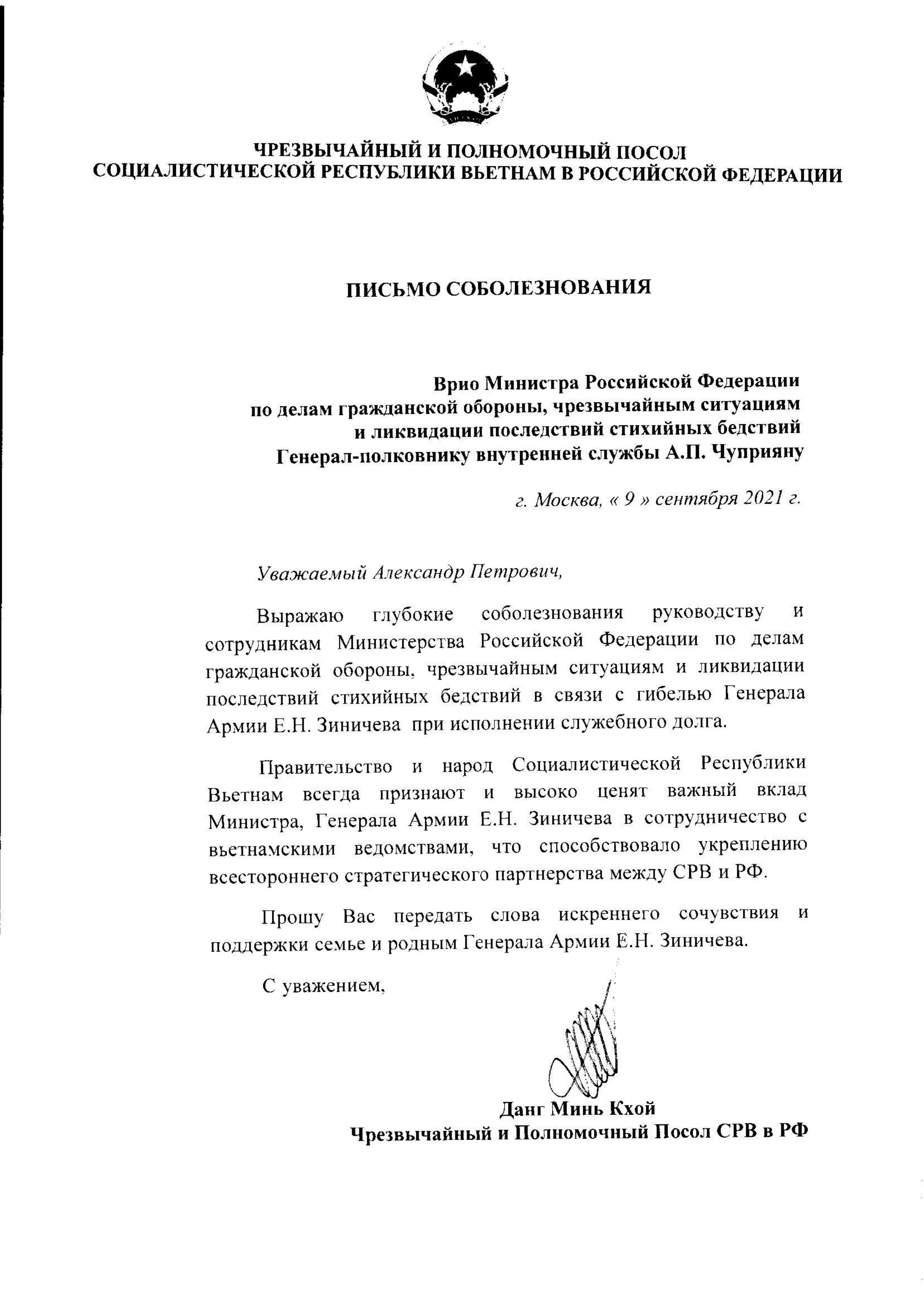Глава МЧС России Евгений Зиничев погиб на учениях в Норильске при исполнении служебного долга, спасая кинорежиссера Александра Мельника. В связи с этим чрезвычайный и полномочный посол Социалистической Республики Вьетнам в Российской Федерации Данг Минь Кхой направил письмо с соболезнованиями в адрес врио главы МЧС Александра Чуприяна.