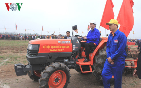 (VOVworld) – Утром 3 февраля в общине Дойшон уезда Зюйтиен провинции Ханам состоялась церемония открытия праздника начала обработки земли 2017 (Титьдиен Дойшон) с участием президента Вьетнама Чан Дай Куанга. На этом традиционном мероприятии начинается обработка земли и люди молятся за благоприятные погодные условия и хороший урожай в новом году. Выступая на празднике, глава государства подчеркнул, что среди тысяч традиционных праздников по всей стране ежегодный праздник «Титьдиен Дойшон» внесен в список объектов нематериального культурного наследия государственного значения. Проведение этого праздника имеет большое значение для сохранения и развития культурных ценностей и поощрения жителей на развитие сельского хозяйства. Президент Чан Дай Куанг предложил властям разных уровней и жителям успешно выполнить курс и политику партии и государства по развитию сельского хозяйства, крестьянства и деревни, а также по строительтву новой деревни.