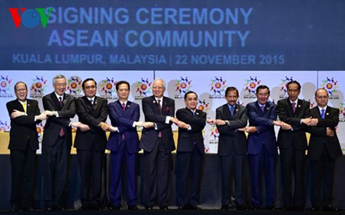 (VOVworld) - Продолжая работу 27-го саммита АСЕАН, утром 22 ноября в Куала-Лумпуре премьер-министр СРВ Нгуен Тан Зунг вместе с лидерами стран-членов Ассоциации государств Юго-Восточной Азии (АСЕАН) подписали Декларацию о создании единого Сообщества 31 декабря 2015 года и Декларацию «АСЕАН: Видение-2025», являющуюся «дорожной картой» по развитию региональной организации на ближайшее десятилетие. Это исторические документы в процессе интеграции и развития АСЕАН спустя около полувека её развития. Это событие привлекает к себе большое внимание не только жителей 10 стран ЮВА, но и всего международного сообщества.