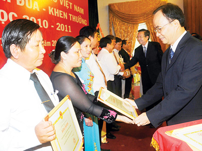 Также вечером 19-ого ноября отрасль образования города Хошимин организовала церемонию честования и вручения в 14-ый раз премии имении Во Чыонг Тоана 30-ти из 60 тысяч учителей и преподавателей города за блестящие успехи в работе. Многие из них, несмотря на большие трудности, отдали всю душу и силы делу воспитания человека. Чан Тхи Бинь – учительница специальной школы Бинь Минь района Танфу, которая получила вышеуказанную премию за инициативу в обучении детей с физическими недостатками, поделилась своими размышлениями: