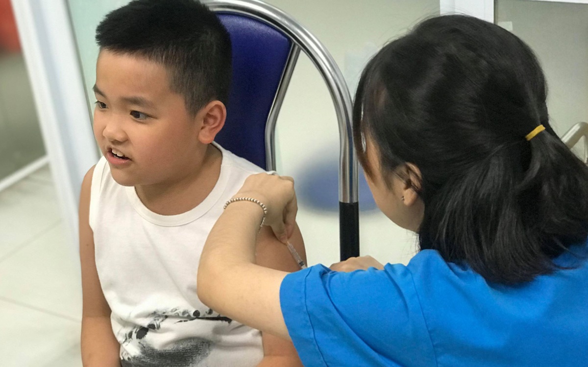 | Cậu bé được mẹ đưa đi tiêm nhắc lại viêm não Nhật Bản. |
