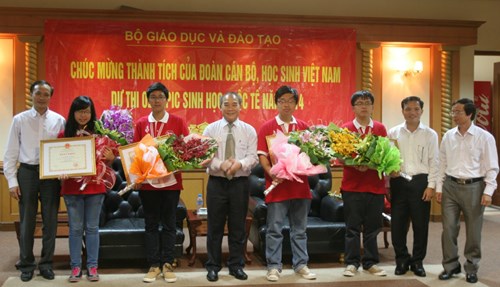| พิธีต้อนรับการกลับบ้านและมอบหนังสือชมเชยให้แก่นักเรียน๔คนที่เข้าร่วมการแข่งขันโอลิมปิกชีวภาพระหว่างประเทศครั้งที่๒๕ที่อินโดนีเซีย (Photo:Baomoi.com) |