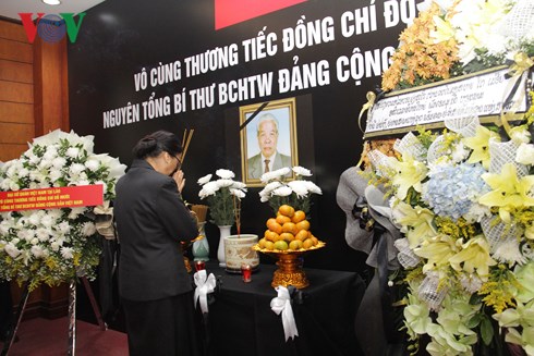 เลขาธิการใกญ่พรรค ประธานประเทศลาว Bounnhang Vorachith นำคณะผู้แทนพรรคประชาชนปฏิวัติลาวได้เดินทางมายังสถานทูตเวียดนามเพื่อวางพวงมาลาไว้อาลัยอดีตเลขาธิการใหญ่พรรคคอมมิวนิสต์เวียดนามโด๋เหมื่อย นอกจากนี้ยังมีผู้แทนของกระทรวงหน่วยงานของลาว สถานทูตและคณะทูตานุทูตประเทศต่างๆในประเทศลาว ชมรมชาวเวียดนามในประเทศลาวได้เดินทางมาร่วมแสดงความเสียใจต่อการจากไปของท่านโด๋เหมื่อย |