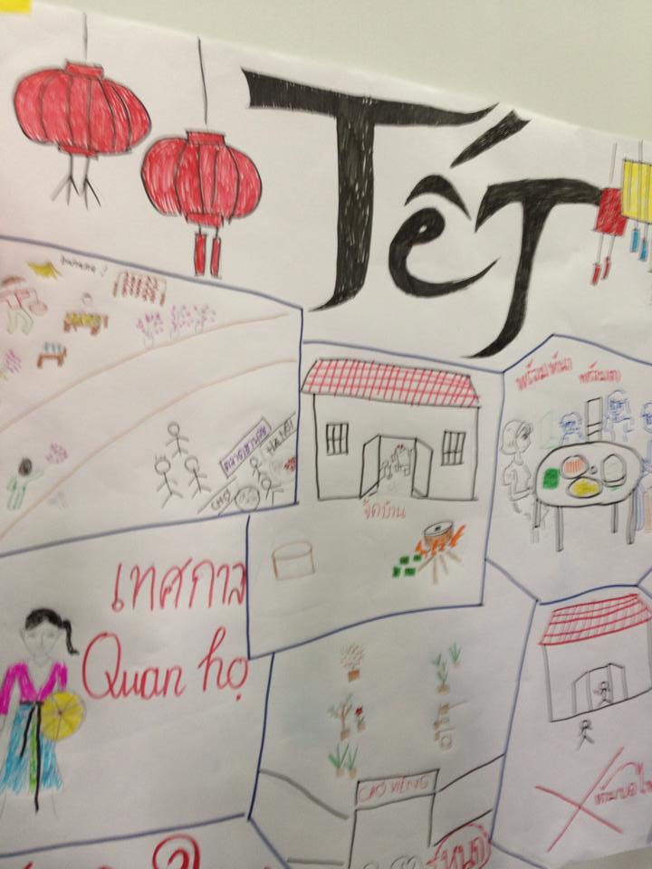 นอกจากการแสดงละครเกี่ยวกับตรุษเต๊ดแล้ว ก็ยังมีการแนะนำชุดประจำชาติ อาหารเวียดนาม สถานที่ท่องเที่ยว มวยไทยและเทศการต่างๆของไทย เป็นต้น ผ่านภาพประกอบ ยกตัวอย่างเช่นกลุ่มของนักศึกษาเหงียนนามแค้ง จากมหาวิทยาลัยฮานอยได้แนะนำเกี่ยวกับอาหารพื้นเมืองเวียดนาม เช่น ภาคเหนือมีเฝอหรือก๋วยเตี๋ยว บุ๊นเรียวกัวหรือขนมจีนแกงซ้มปูและบุ๊นจ๋าหรือขนมจีนหมูย่าง ส่วนภาคกลางมีเมี๊ยนเลือนหรือวุ้นเส้นปลาไหล ขนมแบ่วและขนมบดหลอกที่กรุงเก่าเว้ ส่วนภาคใต้จะมีขนมเบื้องเวียดนาม คุณนามแค้งเผยว่า “ผมแนะนำให้เพื่อนๆชาวไทยได้รู้จักถึงความแตกต่างของรสชาดอาหารเวียดนามทั้งสามภาค นี่เป็นครั้งที่สองที่ผมเข้าร่วมโครงการนี้ ในครั้งก่อนผมได้มีโอกาสไปยังประเทศไทยจึงอยากทำการเปรียบเทียบกับวัฒนธรรมการกินของคนไทยด้วย ถ้าหากเปรียบเทียบกับคนเวียดนามภาคเหนือ คนไทยจะกินเผ็ดและหวานกว่า”