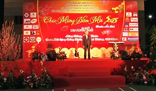 ส่วนในค่ำวันเดียวกัน ที่กรุงเวียงจันทน์ สถาทูตเวียดนามประจำประเทศลาวได้ร่วมมือกับศูนย์วัฒนธรรมเวียดนามประจำลาวเปิดงานหนังสือพิมพ์ภายใต้หัวข้อ ฉลองวสันต์ฤดูใหม่เพื่อฉลองครบรอบ 85 ปีวันก่อตั้งพรรคคอมมิวนิสต์เวียดนาม โดยแนะนำภาพรวมเกี่ยวกับสื่อมวลชนเวียดนาม ซึ่งชาวเวียดนามที่อาศัยและศึกษาในประเทศลาวเข้าร่วมงานเป็นจำนวนมากและได้รับแจกหนังสือพิมพ์ฉบับต่างๆด้วยความปลื้มปิติซึ่งถือเป็นการส่งเสริมการมุ่งใจสู่ปิตุภูมิ นายเหงียนแหมงหุ่ง เอกอัครราชทูตเวียดนามประจำประเทศลาวเผยว่า“ชาวเวียดนามที่อาศัยในประเทศลาวมีความยินดีเป็นอย่างมากที่ได้รับอาหารทางจิตใจนี้ นั่นคือข่าวสารล่าสุดเกี่ยวกับประเทศเวียดนามในช่วงตรุษเต๊ดปีมะแม ในนามของชาวเวียดนามที่อาศัยในประเทศลาว ผมขอขอบคุณสื่อมวลชนเวียดนามที่ได้ให้การช่วยเหลือสถานทูตเวียดนามประจำประเทศลาวในการจัดงานครั้งนี้”