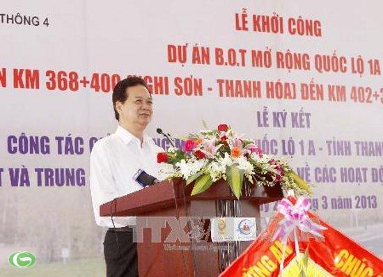 (VOVWorld)-เช้าวันที่๒๖มีนาคม ณ อำเภอ Quỳnh Lưu จังหวัด Nghệ An นายกรัฐมนตรี Nguyễn Tấn Dũng ได้เข้าร่วมพิธิเปิดโครงการยกระดับและขยายทางหลวงหมายเลข ๑เอ ตั้งแต่อำเภอNghi Sơn จังหวัด Thanh Hóa ถึงอำเภอ Cầu Giát จังหวัด Nghệ An รวมระยะทาง๓๔กิโลเมตร โครงการดังกล่าว ใช้เงินทุนBOT กว่า๓ล้าน๖แสนล้านด่ง โดยจะปฏิบัติตั้งแต่ปี๒๐๑๓ถึงปลายปี๒๐๑๕ ในการกล่าวปราศรัย ณ พิธี นายกรัฐมนตรี Nguyễn Tấn Dũng ได้ชมเชยบริษัทก่อสร้างโครงสร้างคมนาคมหมายเลข๔ บริษัท๓๑๙สังกัดกระทรวงกลาโหมและหน่วยงานที่เกี่ยวข้องที่เสร็จสิ้นการทำระเบียบการต่างๆเพื่อให้โครงการได้รับการปฏิบัติโดยเร็ว พร้อมทั้งกำชับให้นักลงทุนค้ำประกันคุณภาพของโครงการ ท่าน Nguyễn Tấn Dũng ยังได้เสนอให้กระทรวงคมนาคมขนส่ง หน่วยงานที่เกี่ยวข้องของจังหวัดและนครที่มีทางหลวงหมายเลข ๑เอผ่านเน้นการเวนคืนที่ดินเพื่อให้โครงการขยายทางหลวงหมายเลข ๑เอ ได้รับการปฏิบัติตามกรอบเวลาที่กำหนด ตามนโยบายและข้อกำหนดของกฏหมาย ./.