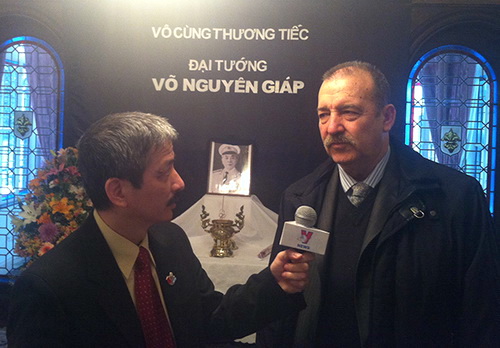 | นาย Patricio Echegaray เลขาธิการใหญ่พรรคคอมมิวนิสต์อาร์เจลตินาให้สัมภาษณ์นักข่าวของสำนักข่าวเวียดนามในพิธีไว้อาลัยพลเอก หวอเงียนย้าป (vietnamplus) |
