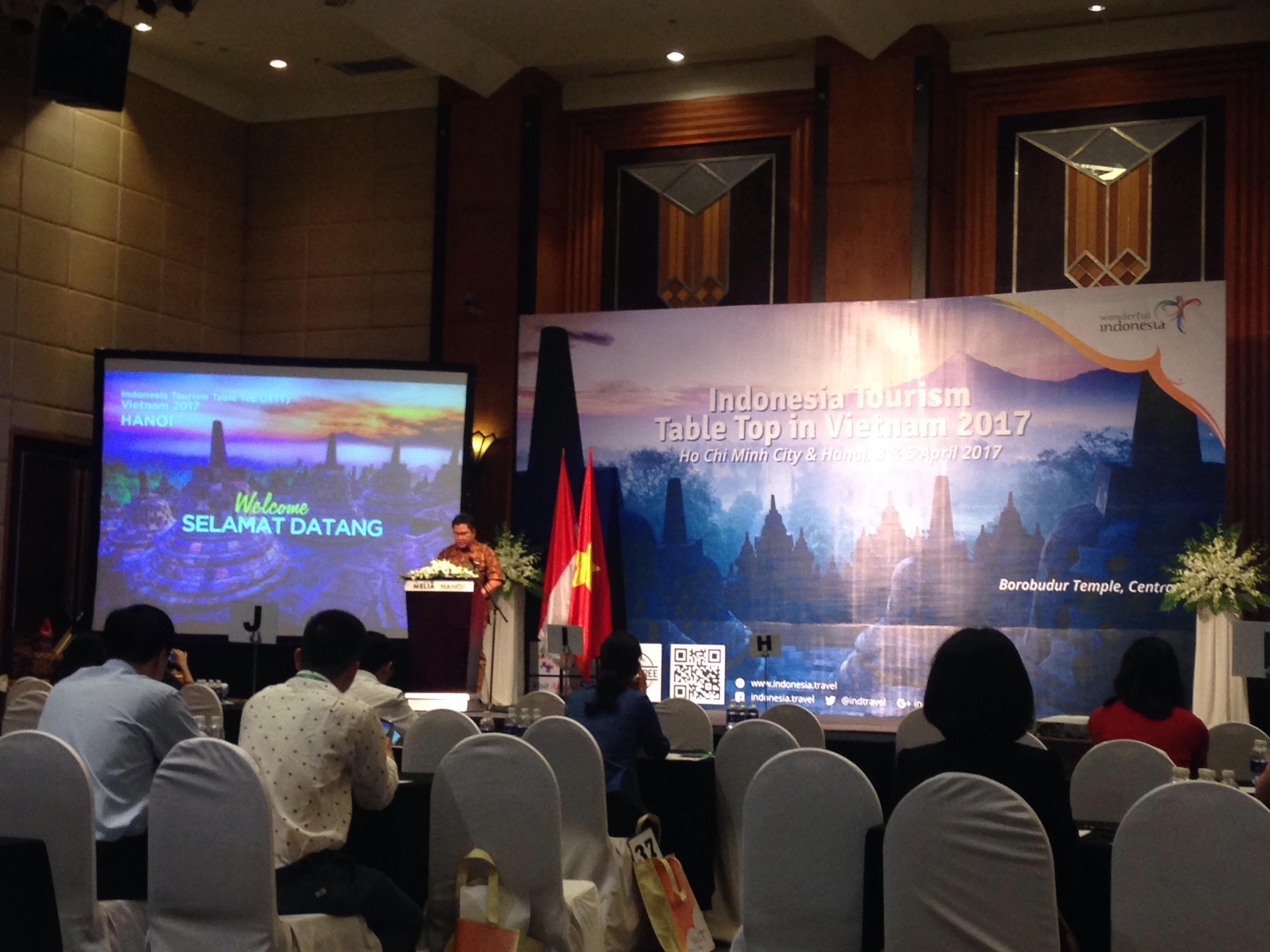 (VOVworld) – “อินโดนีเซียเป็นทุกสิ่งที่คุณสามารถจินตนาการได้” และ“อินโดนีเซีย-เป็นจุดหมายปลายทางที่มีอาหารอร่อยๆ” นี่คือหนึ่งในคำขวัญที่ตัวแทนของบริษัทนำเที่ยวอินโดนีเซียเสนอเพื่อแนะนำความงามของประเทศนี้ในการสัมมนาการท่องเที่ยว “Indonesia Toursim Table Top” โดยกระทรวงการท่องเที่ยวอินโดนีเซียประสานกับสถานทูตอินโดนีเซียประจำเวียดนามจัดขึ้นเมื่อวันที่ 5 เมษายน ณ กรุงฮานอย นี่คือเวทีเพื่อให้สถานประกอบการด้านการท่องเที่ยวของอินโดนีเซียและบริษัทนำเที่ยวของเวียดนามพบปะ แสวงหาโอกาสความร่วมมือเพื่อผลักดันการพัฒนาการท่องเที่ยว