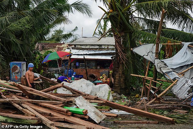 | Một người dân sửa sang lại ngôi nhà sau khi bão Phanfone đi qua. Ảnh: AFP |
