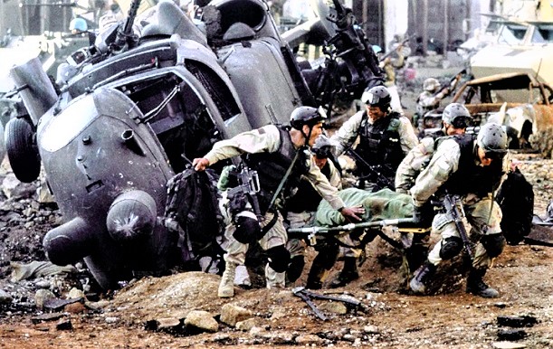 Đoàn xe Mỹ đã bị tấn công dữ dội, các đường phố của Mogadishu sau vài giờ đã xuất hiện nhiều chướng ngại vật nối tiếp nhau. Một trong những chiếc trực thăng Mỹ trong đó có 6 binh sĩ đã bị phiến quân bắn hạ. Các Ranger đã buộc phải cử một bộ phận chiến đấu để bảo vệ những chiếc xe bị tắc đang tìm cách tẩu thoát - những người đang trong vòng vây dày đặc của lực lượng phiến quân. Một cuộc giao tranh khốc liệt xảy ra với ước tính, trong vài giờ không dưới 60.000 viên đạn đã được bắn ra.