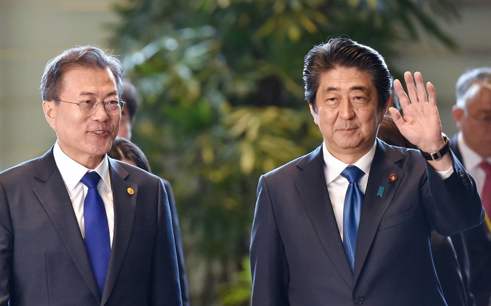 | Tổng thống Hàn Quốc Moon Jae-in (trái) và Thủ tướng Nhật Bản Abe Shinzo (phải). Ảnh: Bloomberg |