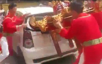Sau khi kính sau ô tô đã vỡ tung, có một người phụ nữ mặc bộ váy đen, được cho là chủ chiếc xe, quỳ gối phía sau xe khấn vái nhiều lần, đoàn rước kiệu mới rẽ sang hướng khác.