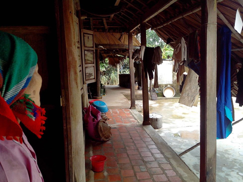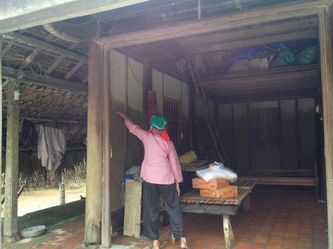 Vừa nói bà cụ vừa chỉ ra cái chậu nhôm to tướng còn phơi ngoài sân. Rồi bà kể tiếp: "Trước tin có lũ là cũng chuẩn bị rồi, nhưng nhà tôi còn đỡ, chứ mấy nhà bên cạnh đây thấp hơn nên phải sơ tán hết. Trong xóm nhà nọ ủng hộ nhà kia, hết cái ăn thì đợi cứu trợ của Nhà nước. Từ hôm lũ đến hôm nay mới được cứu trợ lần đầu tiên đấy, mừng lắm. Cảm ơn các cô các chú...". Nói rồi bà rơm rớm nước mắt.