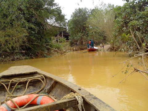Tôi vào nhà bà Hồ Thị Tuyết. Nhà bà nằm ngay sát bến thuyền nơi chúng tôi cập bến hàng cứu trợ. Căn nhà trống tuếch. Bà chỉ cho chúng tôi cái ngấn nước vài hôm trước ngập nay còn in trên tường, nói: "Của cải vật dụng nhà tôi bị trôi đi hết, có cái bàn cái ghế buộc lại được là không trôi thôi…"