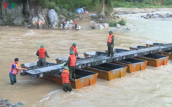 Với tinh thần hết lòng vì người dân vùng lũ, quân đội là lực lượng nòng cốt, xung kích tiếp cận vùng tâm lũ. Giữa bộn bề khó khăn của thời tiết, mưa lũ chia cắt phức tạp, những người lính Cụ Hồ đã kịp thời ứng cứu giúp đỡ nhân dân. Còn nhớ, khi trận lũ xảy ra, các anh đã nhanh chóng bắc chiếc cầu tạm qua sông để tiếp cận địa bàn, vận chuyển từng bao lương thực, thực phẩm đến người dân vùng lũ. Không những thế, việc tháo dỡ nhà cửa bị đổ sập, dọn dẹp đất bùn cũng nhanh chóng được triển khai.