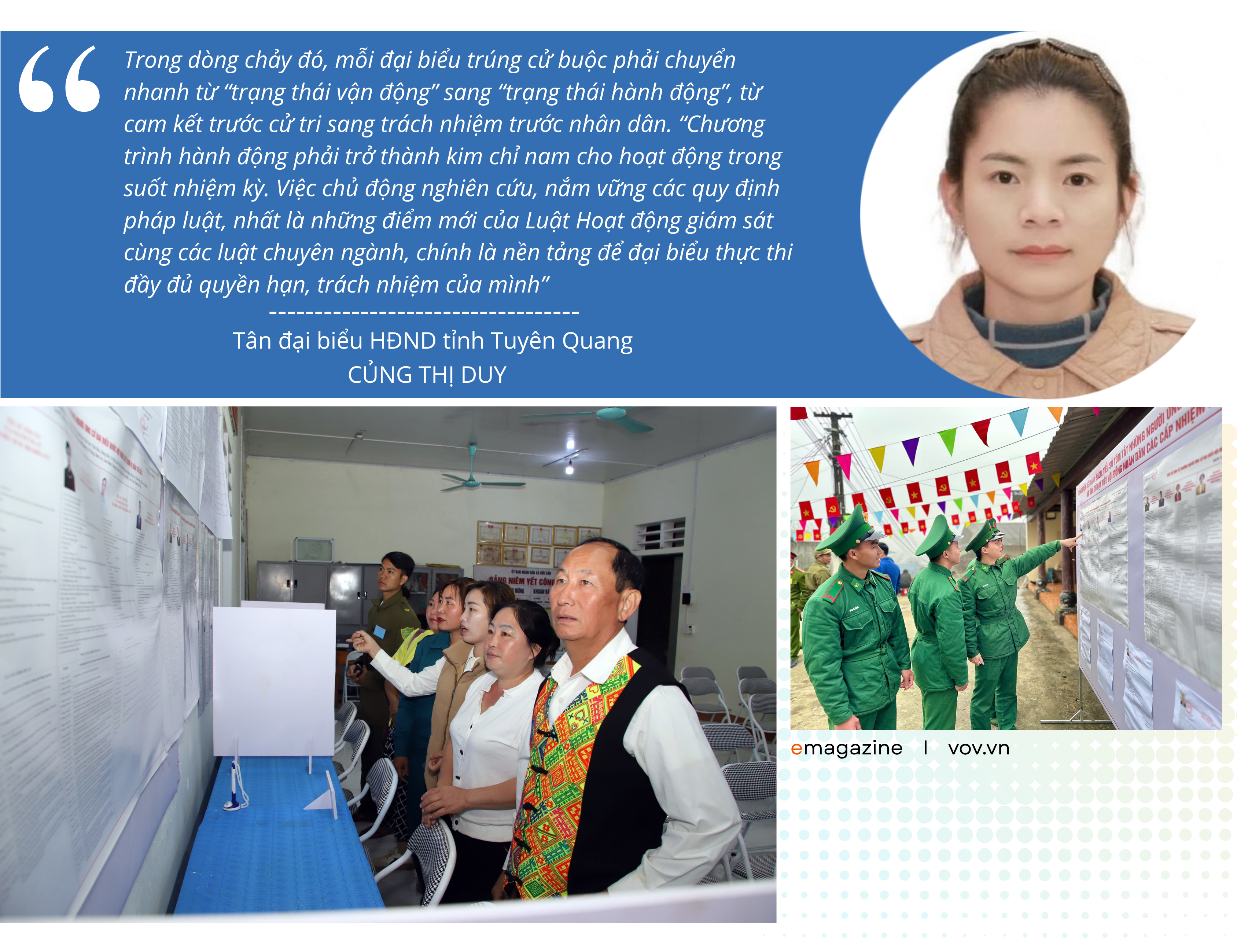 Trong dòng chảy đó, mỗi đại biểu trúng cử buộc phải chuyển nhanh từ “trạng thái vận động” sang “trạng thái hành động”, từ cam kết trước cử tri sang trách nhiệm trước nhân dân. “Chương trình hành động phải trở thành kim chỉ nam cho hoạt động trong suốt nhiệm kỳ. Việc chủ động nghiên cứu, nắm vững các quy định pháp luật, nhất là những điểm mới của Luật Hoạt động giám sát cùng các luật chuyên ngành, chính là nền tảng để đại biểu thực thi đầy đủ quyền hạn, trách nhiệm của mình”, chị Củng Thị Duy, tân đại biểu HĐND tỉnh Tuyên Quang vừa trúng cử chia sẻ.