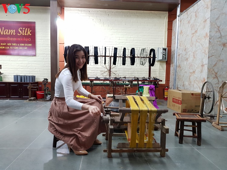 万福村月南丝绸纺织厂厂主阮文南告诉记者:“万福坊为游客参观和体验丝绸纺织流程另辟空间。这是新模式,旨在推介万福手工艺村。织架现在有了改进,但基本仍靠手工,一天能织2至4米布”。