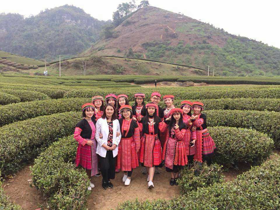 四川外国语大学学生纪星辰和她的老师与同学在越南木州茶田合影 |