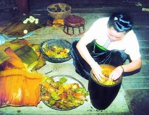 做饼人要巧妙地拿着两头,轻轻地按相反的方向拧,最后叠起来,用薄薄的竹篾系好两头,竹篾要很薄且柔韧,以免弄坏叶子。讲究者只系两圈,长出的竹篾要仔细地打结。然后,将包好的少饼放在木蒸笼上蒸。这样做,饼不仅不会烂糊,还能保持原汁原味。