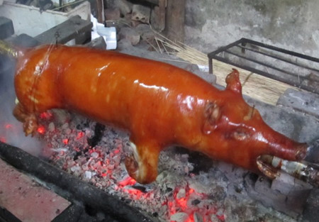 肚子填满山黄皮叶,烤制技术独特的谅山烤猪肉,味道与众不同,猪皮有着野蜂蜜的深黄色,这就是岱依族和侬族烤肉的秘诀所在。烤猪肉不仅是一种特色菜,也是婚礼上的彩礼。