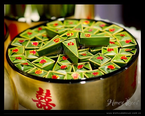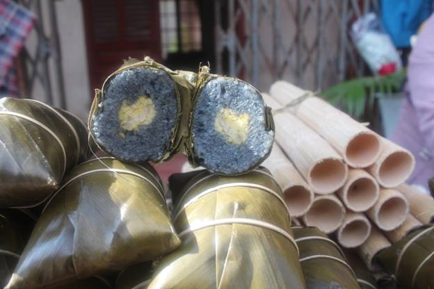 阮氏水说:“包饼的方法会影响其外观和质量。要手巧、心细,籼米饼要匀称,不能漏馅。包的时候要两头细长,中间部分凸出来就像耙齿一样。然后,用绳子绑好。”