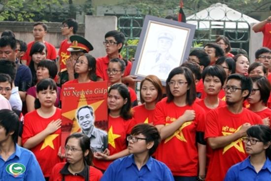 在庄严和悲痛的气氛中,大家通过电视现场直播聆听阮富仲总书记致的悼词。会堂大院设置了多个大屏幕,方便广大市民观看武元甲大将的追悼会。在场市民怀着无限崇敬的心情激动地目送大将灵车返回家乡。