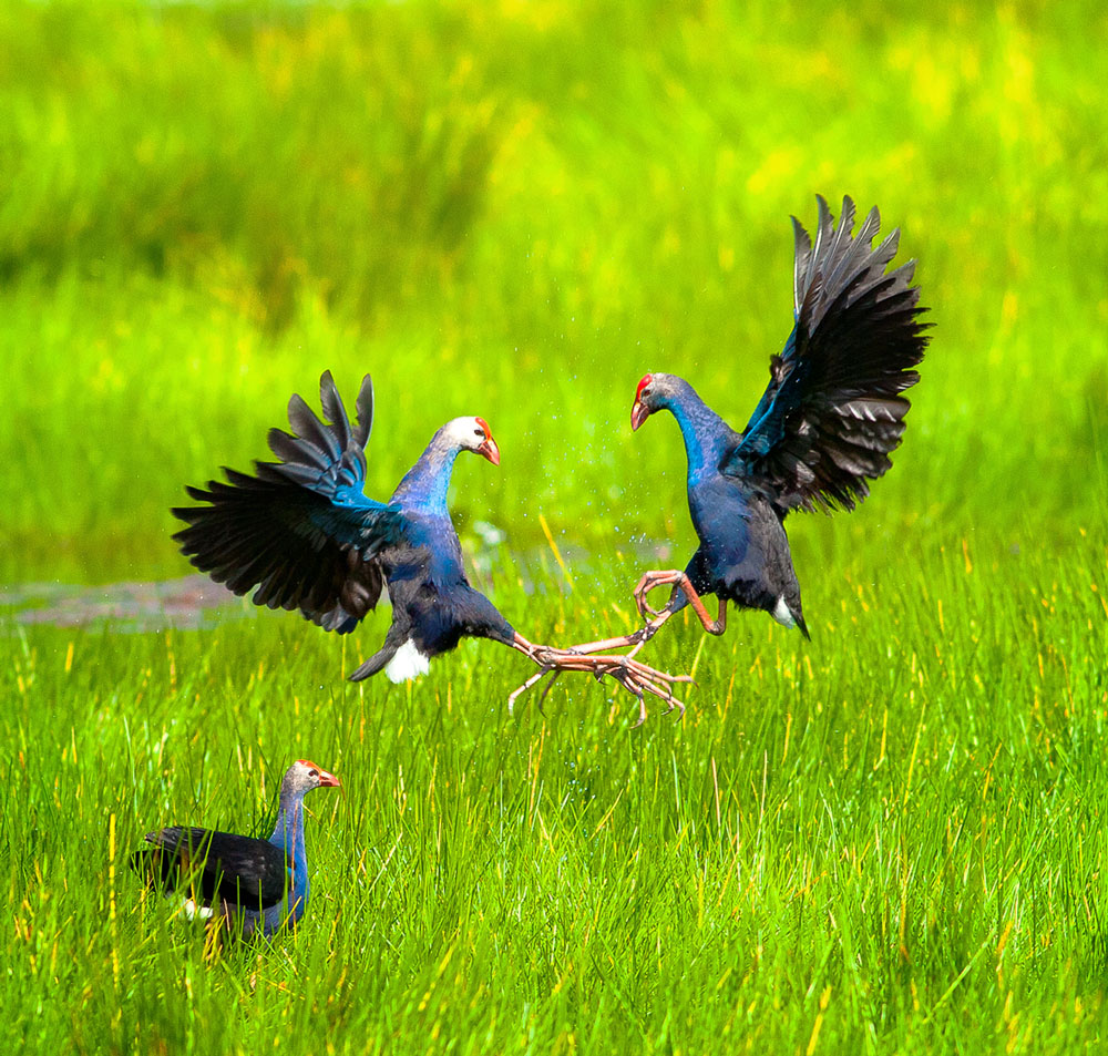 听导游介绍鸟园有关信息后,旅游区船队将送游客进入鸟园。游客将有机会亲眼观察多种野生鸟类的生活习性。早晨或黄昏,到处都是鸟叫声,白鹭从四面八方回巢,景象十分壮观。数千只紫水鸡聚集在莲池,叽叽喳喳一整天。在其觅食的地方,头戴红帽、身穿蓝衣的紫水鸡从容觅食,偶尔还大声鸣叫或表演一段舞蹈。