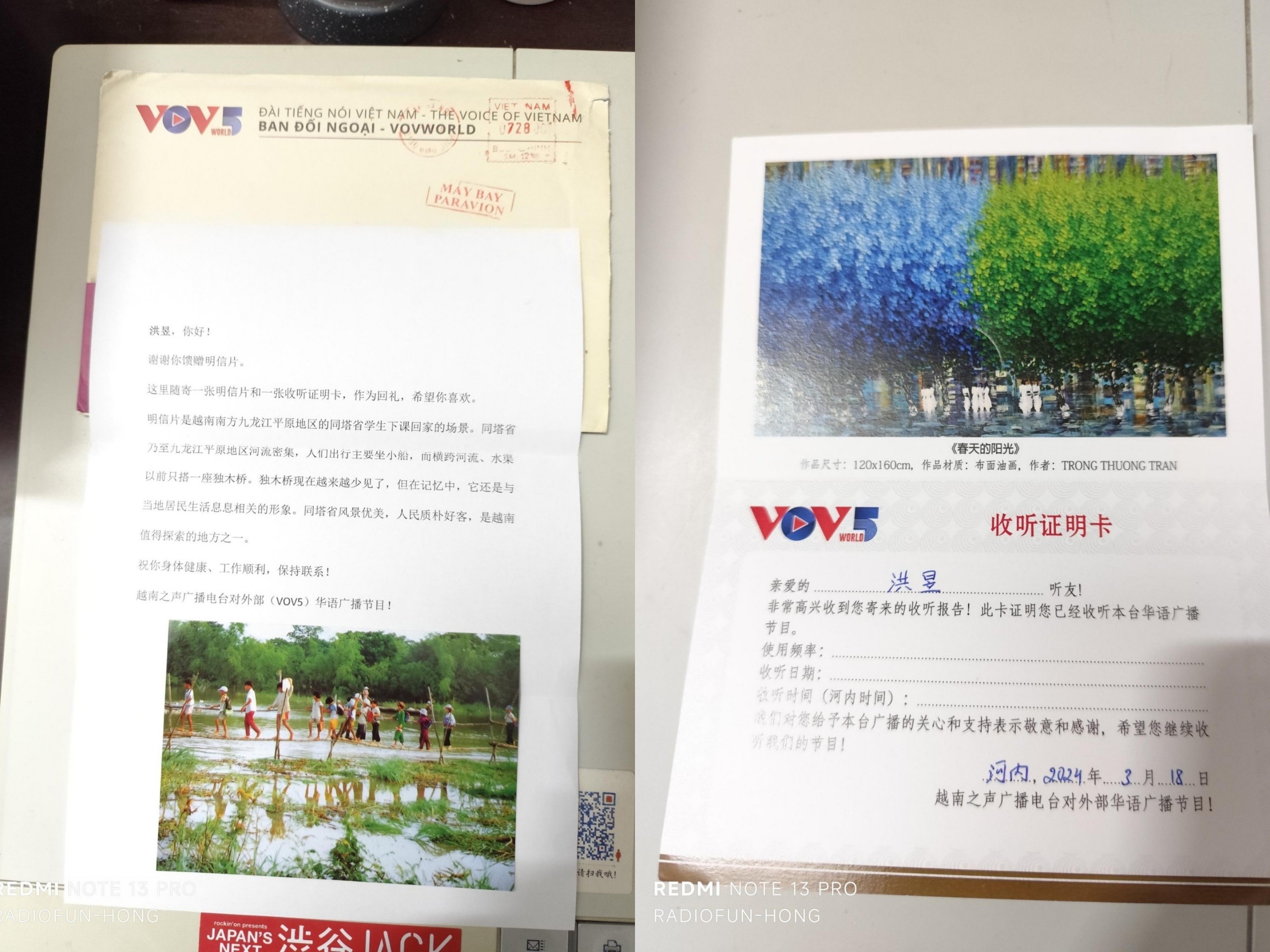 广东省听众洪昱也收到了收听证明卡和明信片。 |