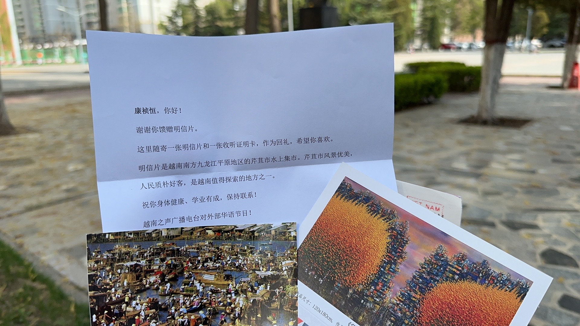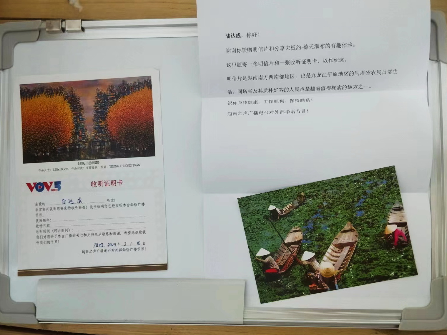 除了上述内容,丁路还给我们发来5月1日世界标准时间11点到11点半7220千赫华语广播节目收听报告。此外,我们也收到四川听众梅林3月17日寄出的一封手写信,其中报告3月16日世界标准时间12点到12点半7220千赫频率的收听状况。他说,信号中等,可收听到越南之声华语节目部的新闻、越南54个民族节目,听友信箱3个节目。