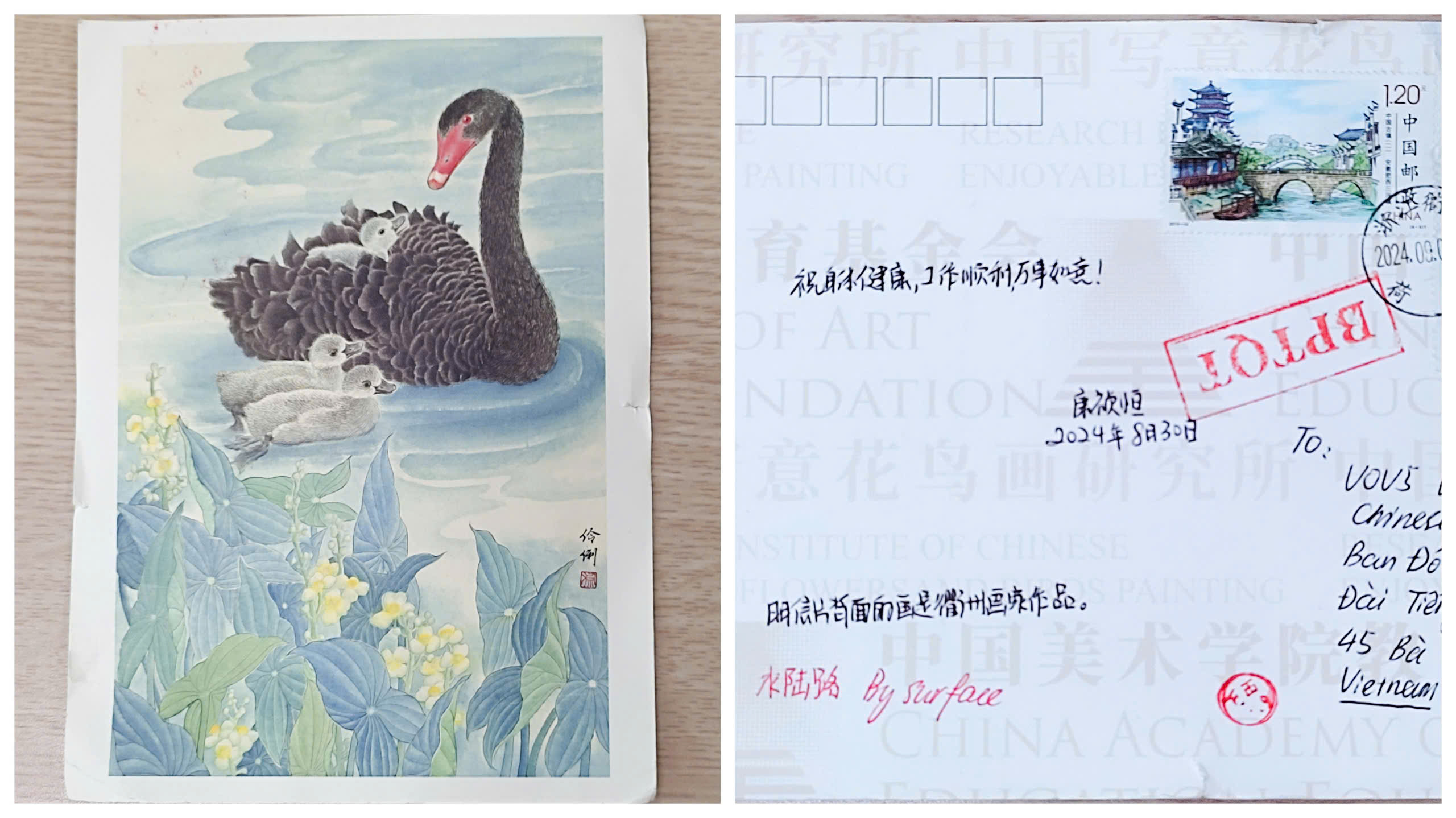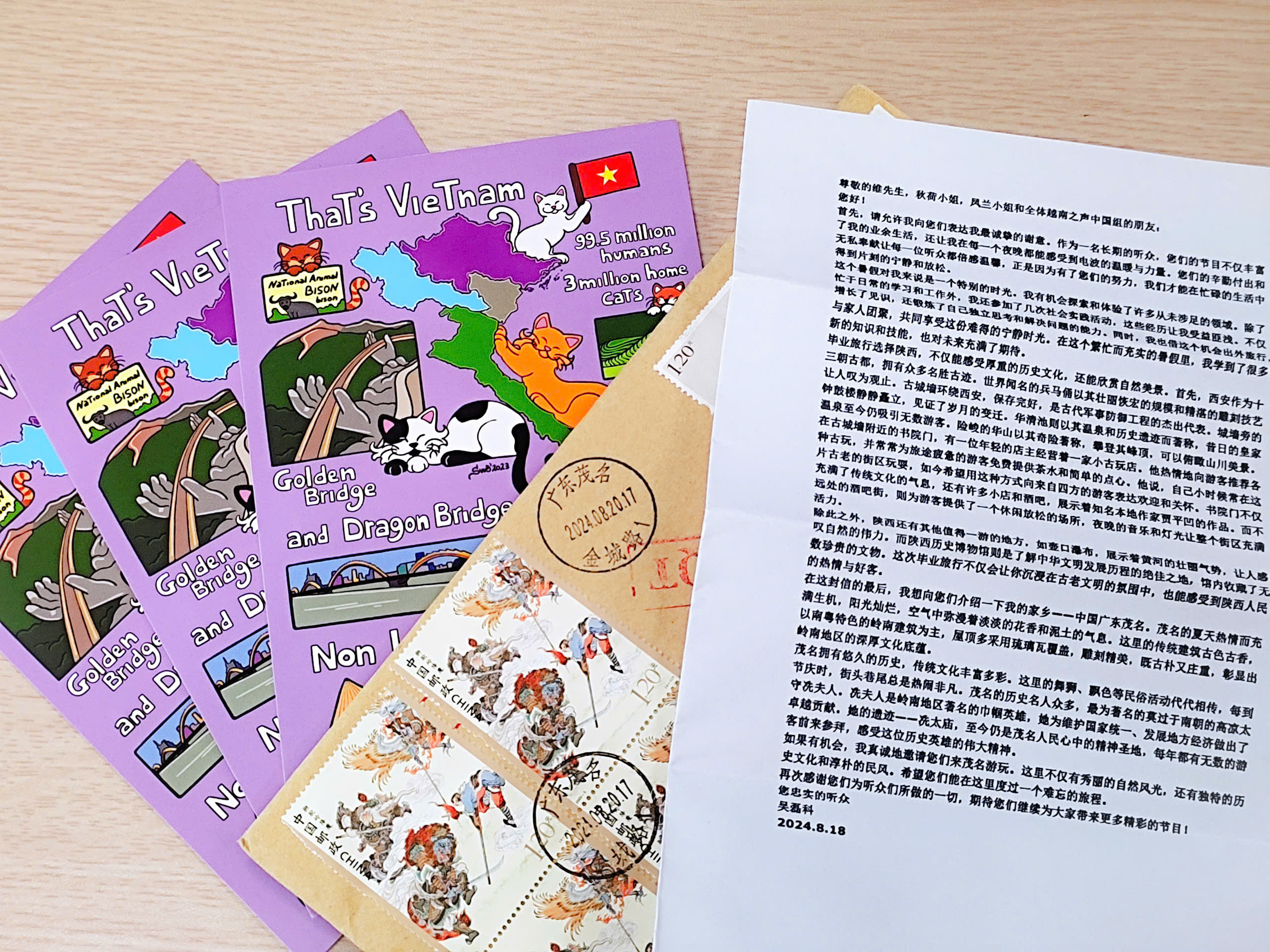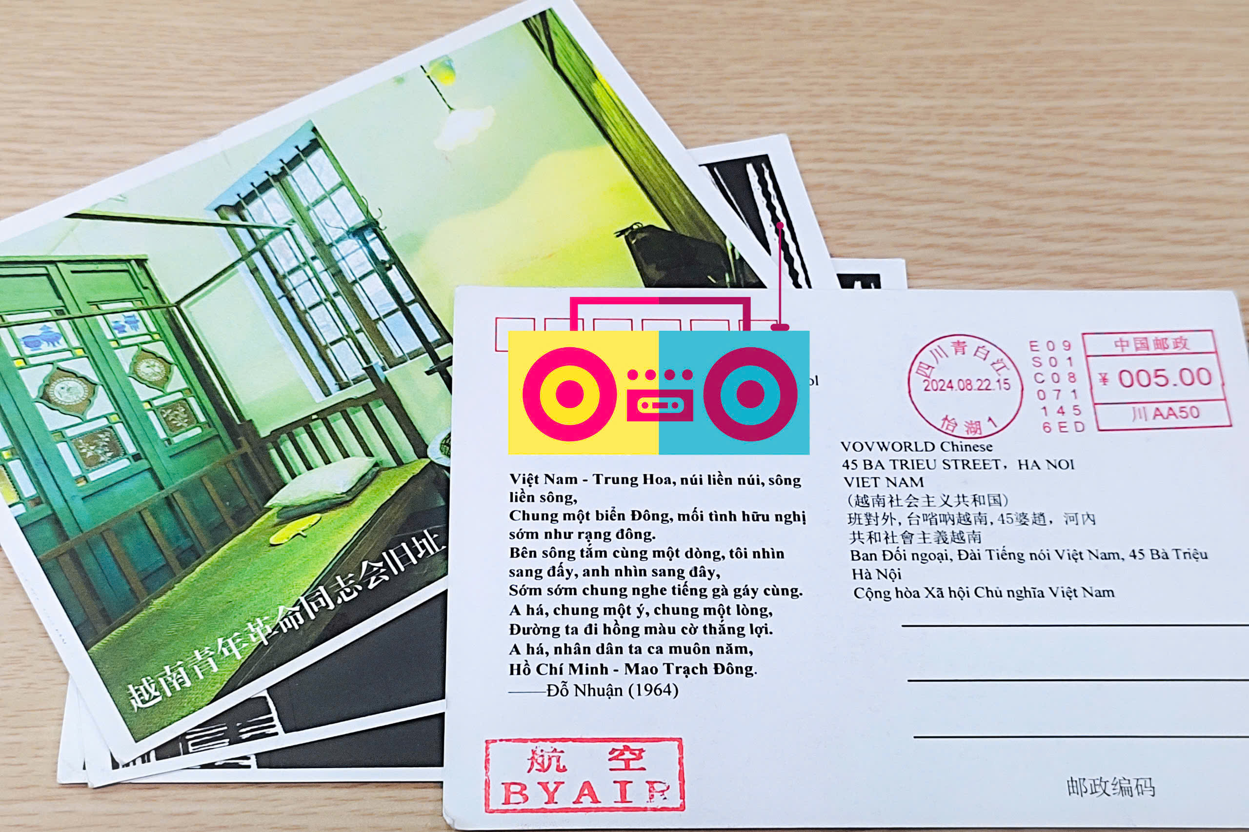 除了上述信件外,我们最近还收到浙江省听众康祯恒的1张明信片,以及四川省听众张瀚文的4张明信片。康祯恒的明信片背面是他的家乡衢州市一位画家的画作。而张瀚文的明信片则写着越南作曲家杜润创作的歌曲《越南中国》的歌词,祝愿越中友谊代代相传。谢谢两位朋友的深厚感情,作为回礼,我们也将会回赠你们明信片,请注意查收。