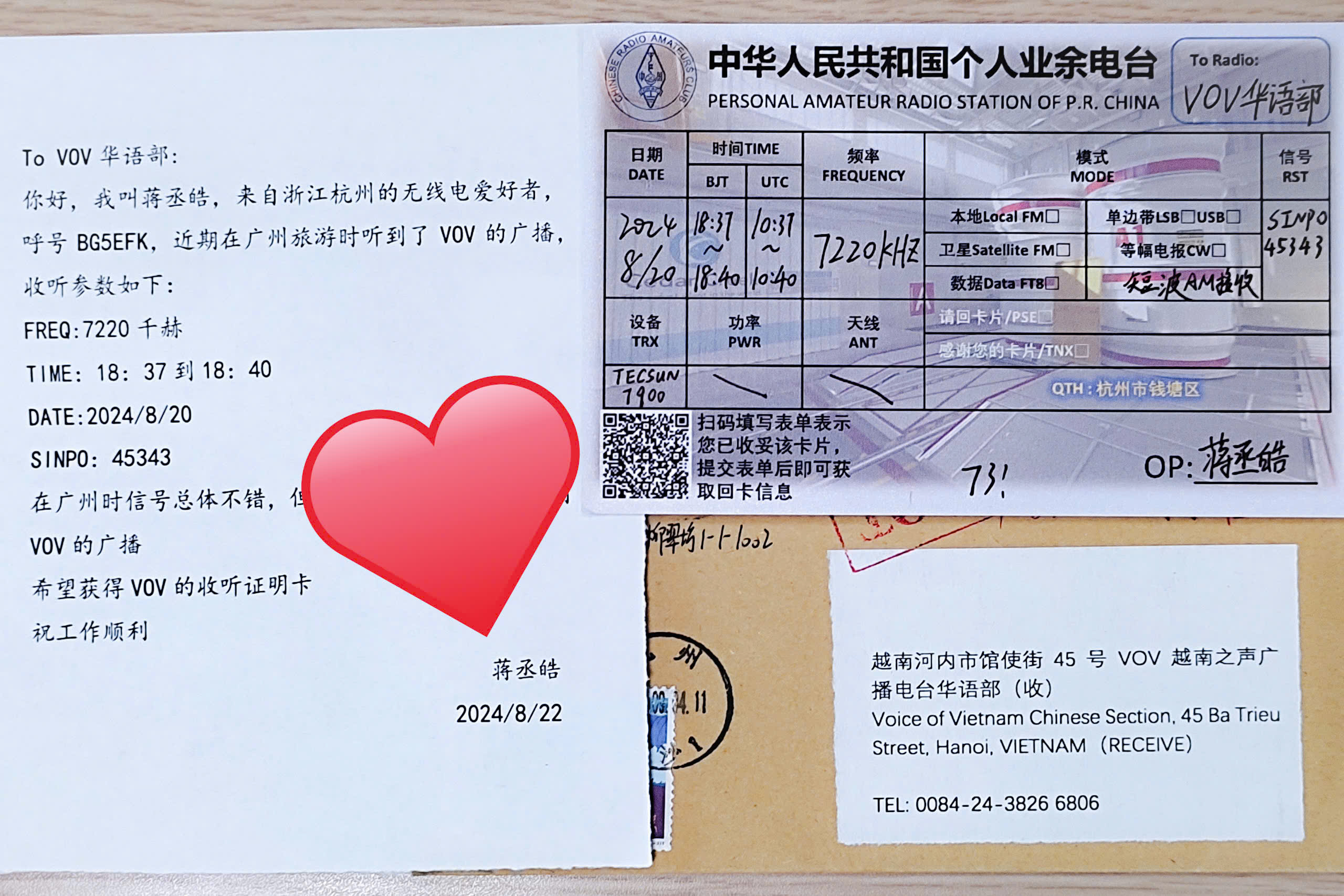 发来收听报告的还有来自浙江杭州的蒋丞皓。这是一封邮寄信件,内容是8月20日同样是7220千赫频率新播出时段的收听效果。蒋丞皓在信中说,收听报告是他今年去广州旅游时收听我们的节目并记录下来的,据他评价,在广州的信号总体不错(SINPO: 45343)。更令人高兴的是,这是我们第一次收到新朋友蒋丞皓的信件。