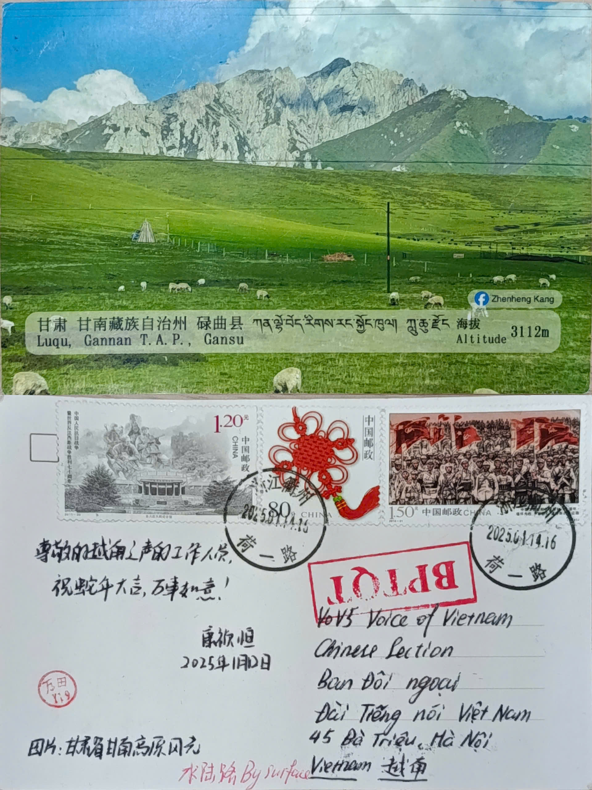 我们最近收到的信件中有浙江省听众康祯恒的明信片。明信片于1月12日寄出,上面的照片是甘肃省苏南藏族自治州碌曲县美丽的草原风光。康祯恒还在明信片上写下了新年的美好祝福。康祯恒听友,谢谢你的心意,作为回礼,我们也将寄给你越南风景明信片。