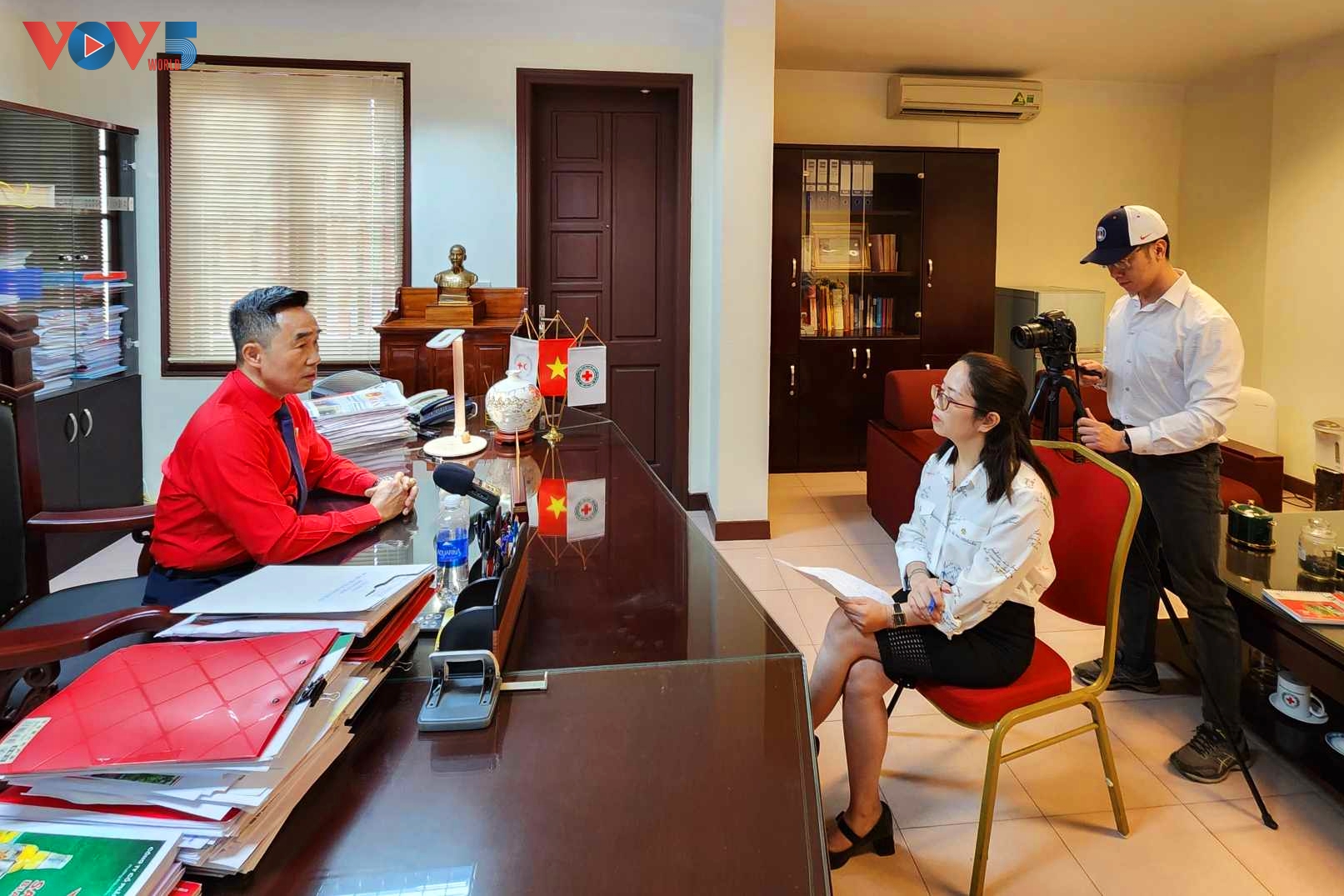 越南红十字会副主席、秘书长阮海英接受本台记者采访。