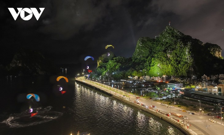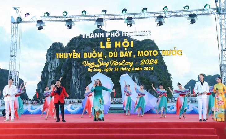 当天下午17点,50多个水面和空中工具进入“舞台”,即下龙花公园对面的水域,进行表演。这个特殊舞台的背景就是世界自然遗产下龙湾的各座岛屿。这让表演更独特、更精彩。