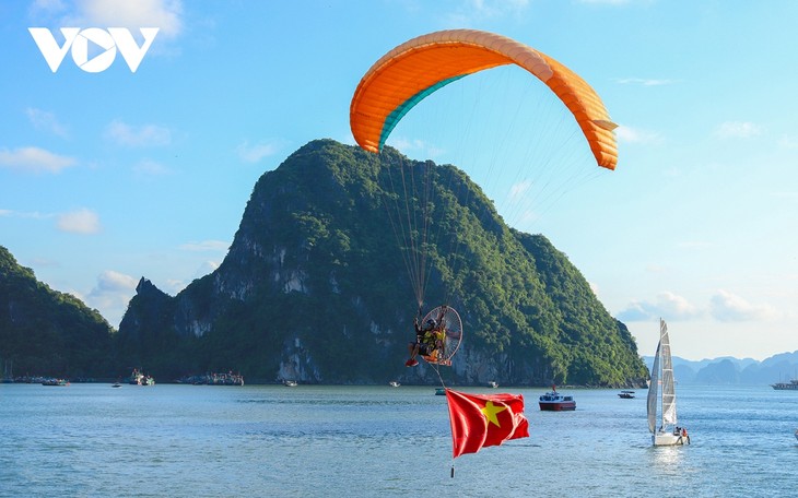 鲜红色的国旗在下龙湾蓝色的天空、大海,绿色的石岛映衬下,更加夺人眼球。这是庆祝八月革命和九二国庆79周年的美丽画面。