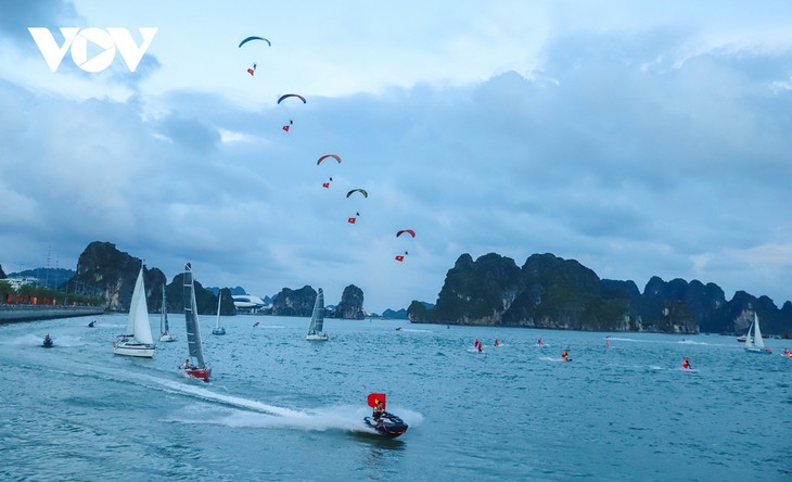 在第一次“下龙冲浪”节框架内,滑翔伞、帆船、摩托艇、喷气式冲浪等新颖且极具吸引力的表演在下龙湾上演。