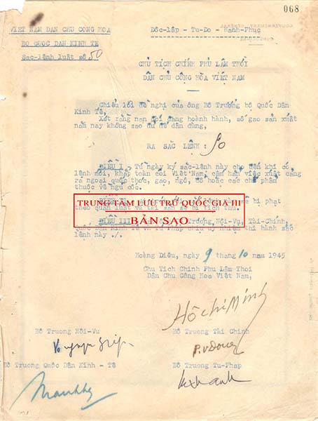 1945年10月12日,在宣告越南民主共和国诞生后不久,胡志明主席签署了关于官方文件题头的第49号法令,其中规定在电报、公函、信件、报纸等官方文件的上方书写“越南民主共和国元年”,其下是独立-自由-幸福。独立-自由-幸福6个珍贵的词语写在“越南民主共和国”(现越南社会主义共和国)国徽下,体现了整个民族的愿望;将胡志明主席“我的同胞自由,我的祖国独立”的心愿和意志变成现实。