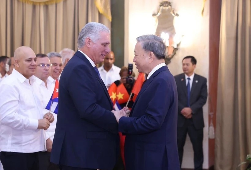 越共中央总书记、国家主席苏林和古巴共产党中央委员会第一书记、古巴共和国主席迪亚斯-卡内尔(Miguel Diaz Canel Bermudez)27日在古巴哈瓦那会见了古巴人民友好与青年代表。