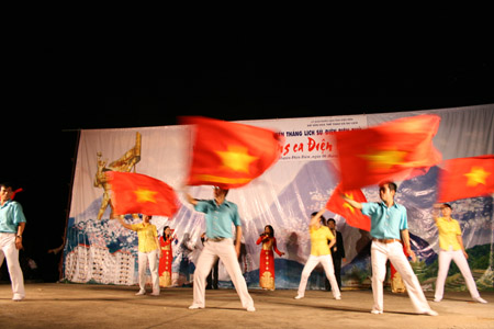 来自越南人民军歌舞剧院和山罗省民族歌舞团的100名艺术家和演员为观众们表演了14个特色节目,其中包括歌颂越南共产党、胡志明主席和武元甲大将的《称赞奠边战士》、《拉炮歌》、《解放奠边》等。晚会上,曾参加奠边府战役的历史亲历者还与观众进行了交流。