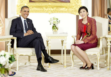 奥巴马与泰国总理英拉举行了会谈。在随后举行的新闻发布会上,英拉表示,奥巴马此行是两国纪念建交180周年之前深化关系的“上佳机会”。