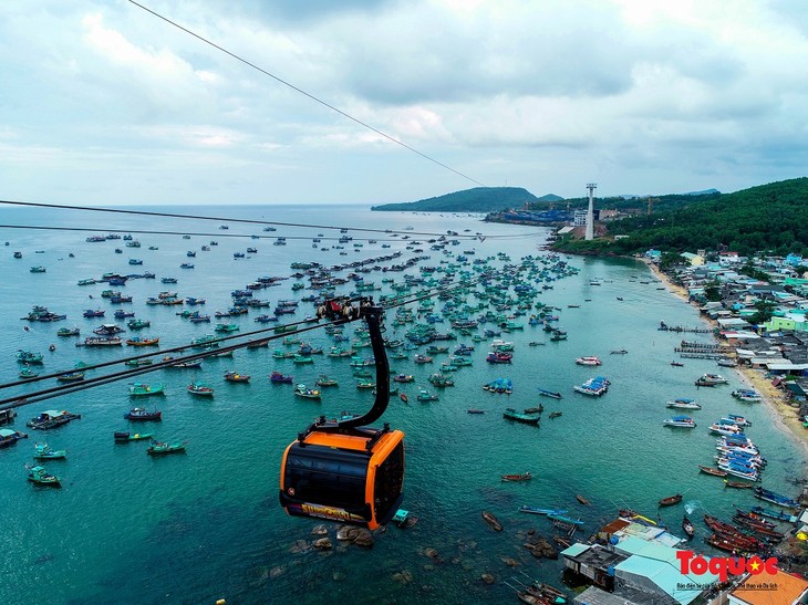 菠萝岛缆车全长7900米,从安泰镇,经饶岛(Hòn Rỏi)、椰子岛(Hòn Dừa),到菠萝岛(Hòn Thơm)。图片来源:《祖国网》。
