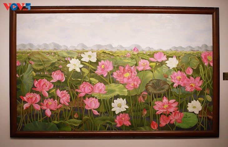 画家金德的《莲花静景》在类似主题的多幅画中最为引人注目。画家让观者仿佛进入了“莲花的静境”,站在飘满花香的莲花潭边,唤醒观者所有的感官。越南佛教教会曾选择这幅画在2022年教会全国代表大会及佛教其他重大节日上展出。