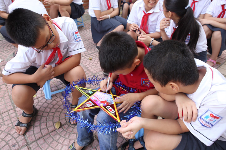 师生们高高兴兴地站在五角星灯旁 学生们通过五角星灯传递1000个爱的信息。此外,他们还可以制作纸面具、中秋礼物等。 |
