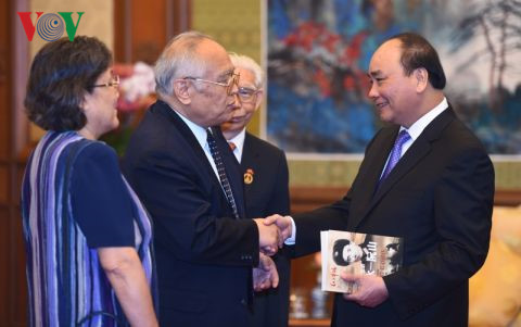 越南政府总理阮春福(右)手拿着关于阮山的书和阮山的中国儿子陈寒风握手