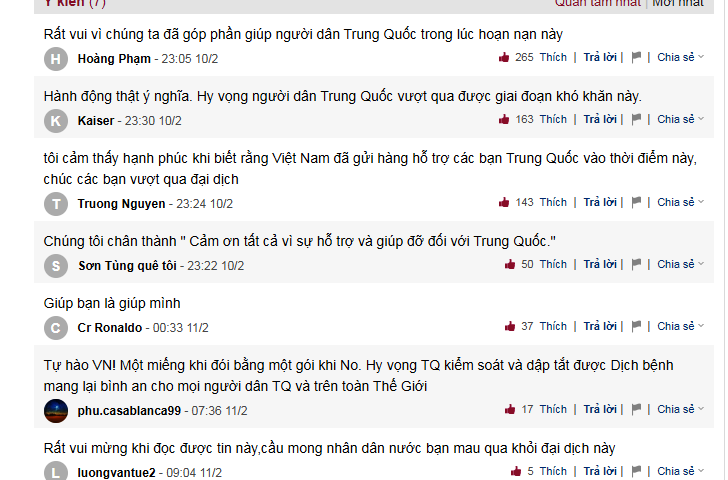 越南政府和红十字会的上述举措也广受越南人民支持。一名越南人在网上留言时表示:“灾难发生时,我们向中国人民提供这些帮助,我为此十分高兴”。另一位网友说:“我为越南在这个时候向中国提供援助而感到幸福,祝中国朋友渡过难关”。有网友还表示:“我为此感到自豪!希望中国早日控制新冠肺炎疫情,为中国乃至世界人民带来平安。”