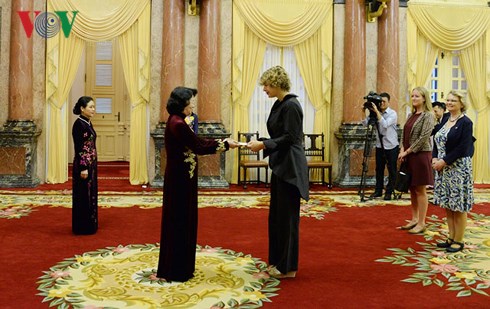 (VOVWORLD) - 10月16日,越南国家代主席邓氏玉盛在主席府会见前来递交国书的荷兰、比利时、丹麦等国驻越大使。